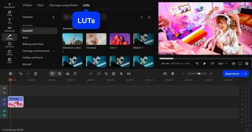 Übernehmen Sie Farbkorrekturen oder wählen Sie LUT-Profile, um Ihrem Video ein einheitliches, hochwertiges Aussehen zu verleihen. Zoomen, skalieren und positionieren Sie Clips bei Bedarf für den letzten Feinschliff.