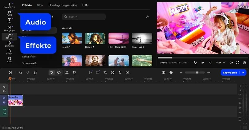 Große Auswahl an Gaming-Effekten: Nutzen Sie Sticker, Übergänge und Effekte im Gaming-Stil, um Highlights, Headshots oder epische Fails hervorzuheben.