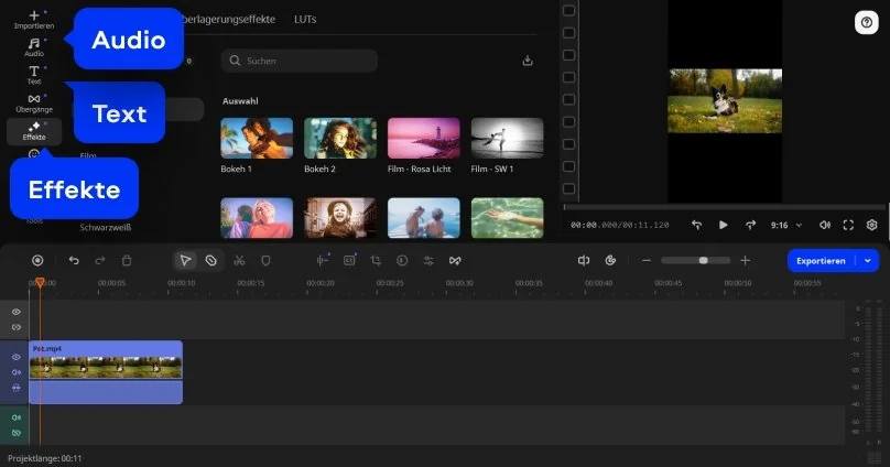 Wählen Sie aus hunderten modernen Übergängen, Filtern und Animationen, um Ihrem Video einen einzigartigen Look zu geben.