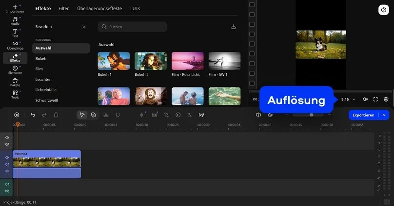 Öffnen Sie Ihr Projekt, klicken Sie auf Seitenverhältnis und wählen Sie 9:16. So wird Ihr Clip perfekt formatiert, um ein Instagram Story Video erstellen zu können. Anschließend können Sie Übergänge, Text oder Sticker hinzufügen, bevor Sie exportieren.