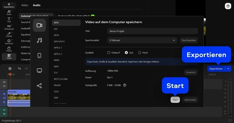 Klicken Sie auf Exportieren, wählen Sie das Format MP4 und speichern Sie Ihr Reel.