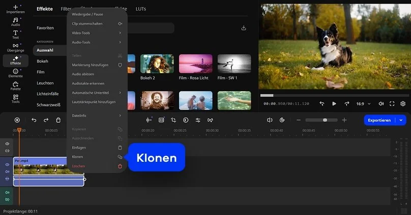 Um ein Loop-Video zu erstellen, braucht man es einfach zu duplizieren. Wählen Sie das Video aus und ziehen Sie den Abspielkopf ans Ende des Videos. Drücken Sie Strg + C und anschließend Strg + V. Wiederholen Sie dies nach Bedarf, bis Ihre Endlosschleife steht. Alternativ können Sie mit der rechten Maustaste auf das Video klicken und die Klonen-Option auswählen.