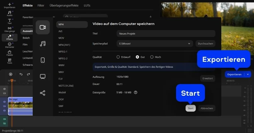 *Die kostenlose Version von Movavi Video Editor kann je nach Version die folgenden Einschränkungen aufweisen: Wasserzeichen auf exportierten Clips, 60 Sekunden Video- oder 1/2 Audiolänge und/oder einige erweiterte Funktionen, die beim Exportieren von Videos nicht verfügbar sind.