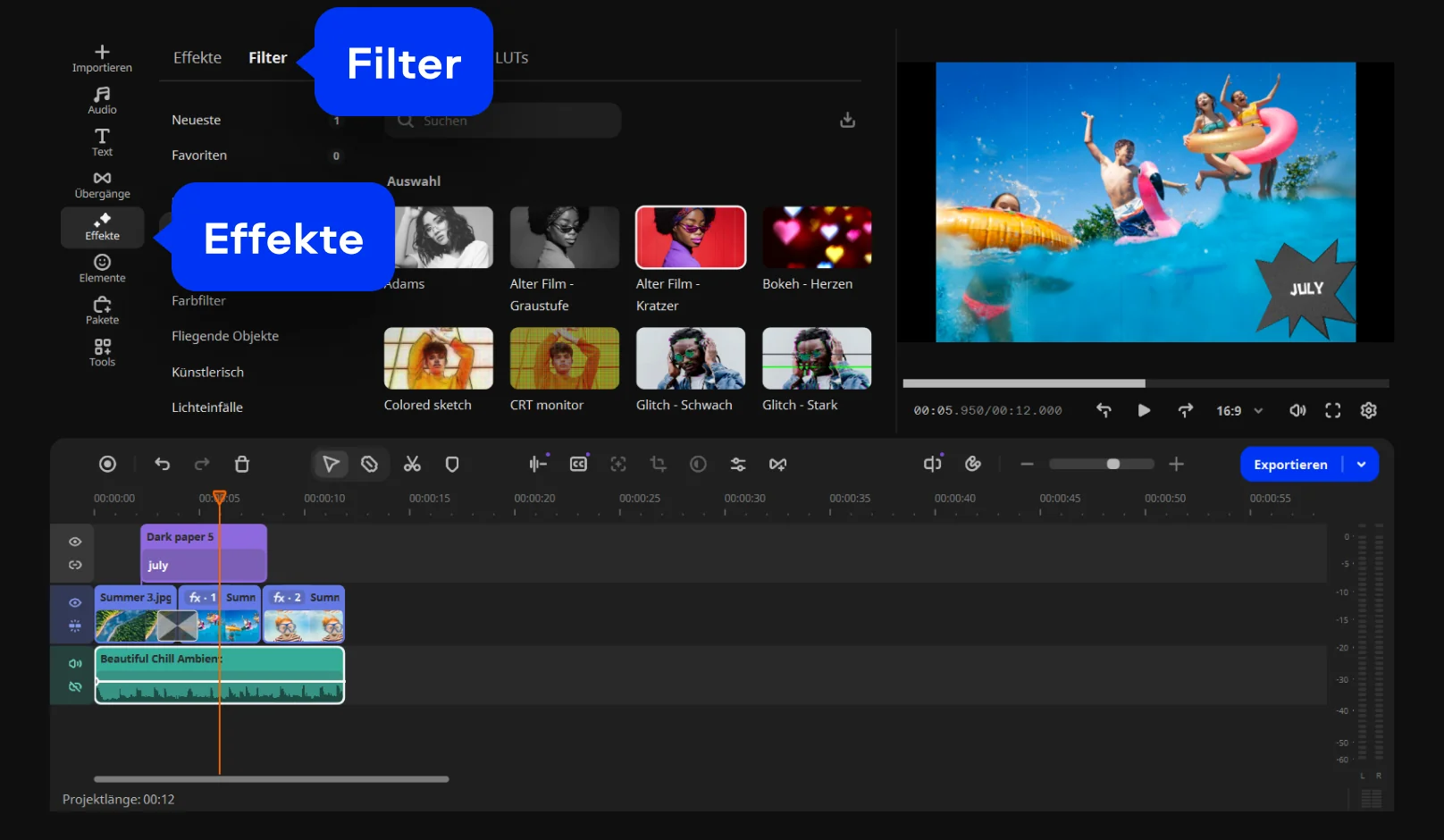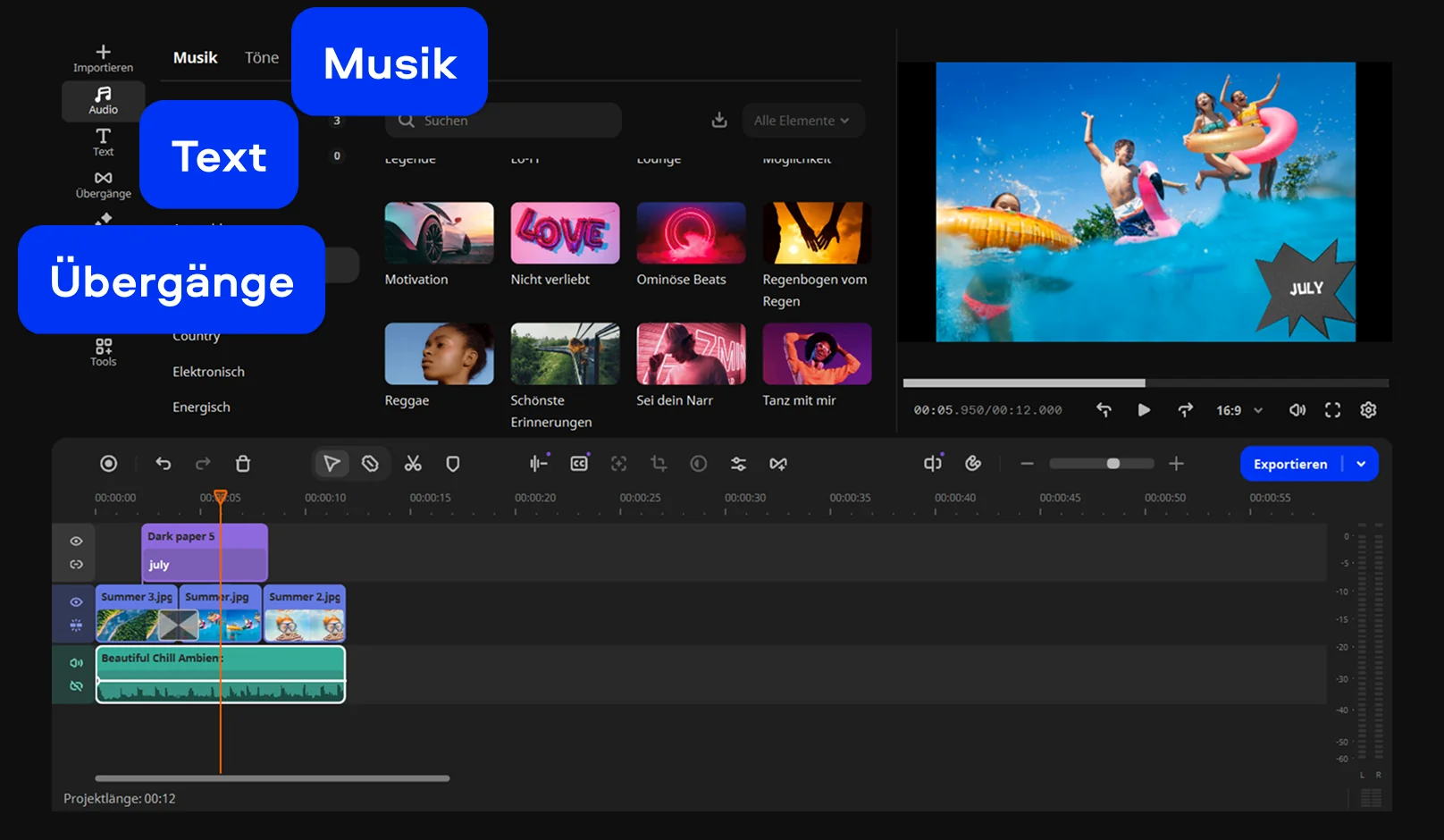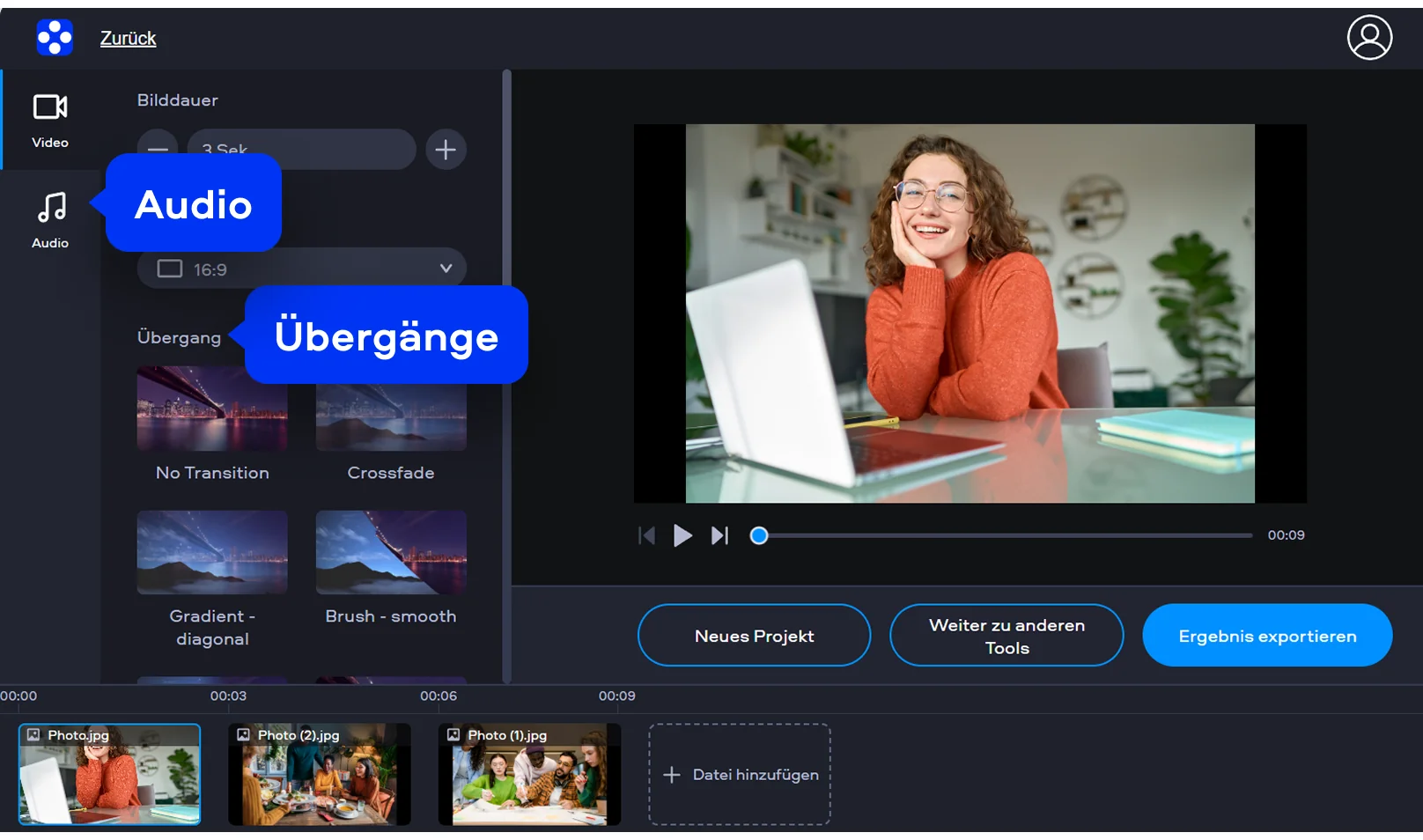 Was ich daran schätze, ist dieser direkte Einstieg. Ich öffne einfach die Seite, ziehe meine Bilder hinein und kann sofort loslegen. Ich ordne die Reihenfolge, probiere Übergänge aus, füge Musik hinzu, alles passiert schnell und ohne Umwege.