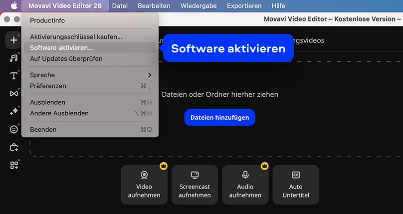 Gehen Sie im Movavi Video Editor zum Hauptprogrammmenü und wählen Sie Software aktivieren.