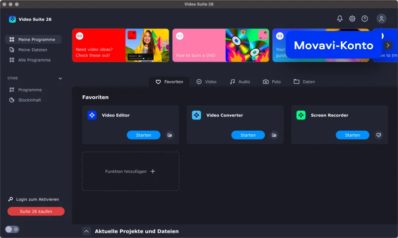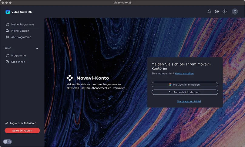 Es gibt drei Möglichkeiten, die Movavi Video Suite zu aktivieren: durch Anmeldung in Ihrem Movavi-Konto; durch Eingabe des Aktivierungsschlüssels in der Video Suite; oder über eines der in der Video Suite enthaltenen Programme.