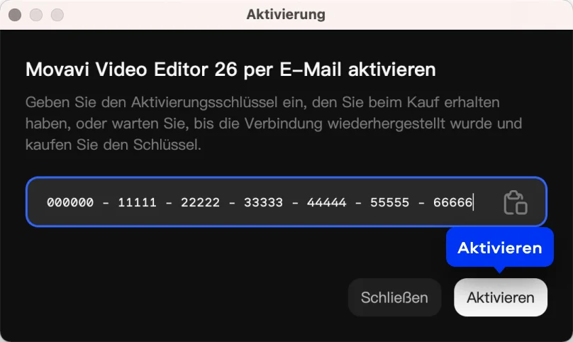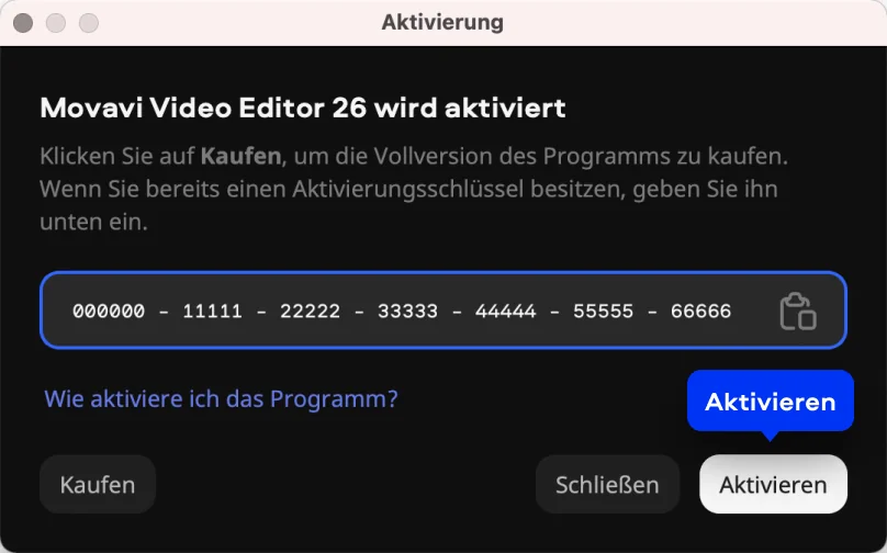 Für die meisten Movavi-Programme gibt es zwei Versionen: eine für Windows und eine für macOS. Vergewissern Sie sich, dass in der E-Mail zur Aktivierung das richtige Betriebssystem angegeben ist. Ist das nicht der Fall, kontaktieren Sie das Support-Team von Movavi. - Wenn Sie versuchen, das Programm offline zu aktivieren, stellen Sie sicher, dass Sie den Aktivierungsschlüssel und den Registrierungsschlüssel in den richtigen Feldern eingegeben haben.