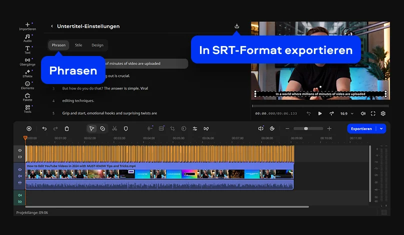 Sobald die Untertitel fertig sind, sehen Sie alle Zeilen auf der Registerkarte Phrasen. Sie können den Text bei Bedarf bearbeiten. Sie können die generierten Untertitel auch als SRT-Datei speichern, indem Sie auf In SRT-Format exportieren klicken.