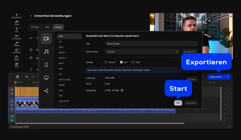 Super! Jetzt ist es Zeit, das Video zu speichern. Klicken Sie auf die Schaltfläche Exportieren, passen Sie die Ausgabeeinstellungen an und klicken Sie auf Start.