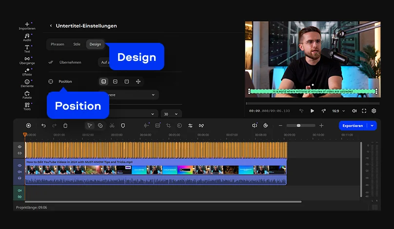 Auf der Registerkarte Design finden Sie verschiedene Einstellungen, um die Untertitel anzupassen. Platzieren Sie die Untertitel an einer beliebigen Stelle im Video – verwenden Sie die Optionen Unten, Mitte und Oben oder passen Sie die Position manuell an.