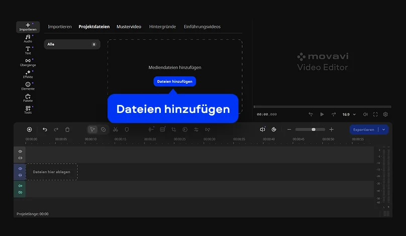 Klicken Sie auf Dateien hinzufügen und wählen Sie Ihr Video aus. Ziehen Sie anschließend die Datei per Drag-and-Drop auf die Zeitleiste.