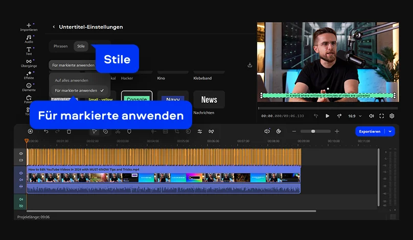 Öffnen Sie die Registerkarte Stile und wählen Sie das Design für Ihre Beschriftungen aus. Es stehen mehr als 30 Stile zur Verfügung, die sich perfekt an jede Art von Videoinhalt anpassen lassen, den Sie erstellen. Das ausgewählte Design wird standardmäßig auf alle Clips angewendet. Wenn Sie unterschiedliche Stile für Clips festlegen möchten, wählen Sie Ihren Clip auf der Zeitleiste aus und wählen Sie Für markierte anwenden aus dem Dropdown-Menü.
