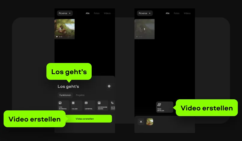 Daraufhin öffnet sich meine Galerie, und ich kann mehrere Clips gleichzeitig auswählen. Am unteren Bildschirmrand erscheint ein kleines Fenster mit einer Vorschau der markierten Dateien. Ich bestätige die Auswahl erneut mit Video erstellen, und die App legt das neue Projekt automatisch in der Timeline an.