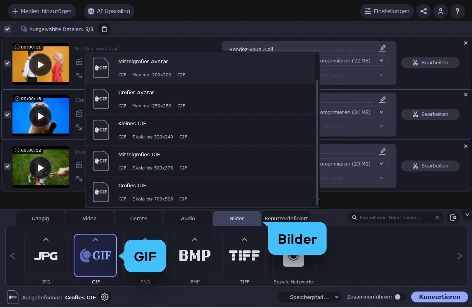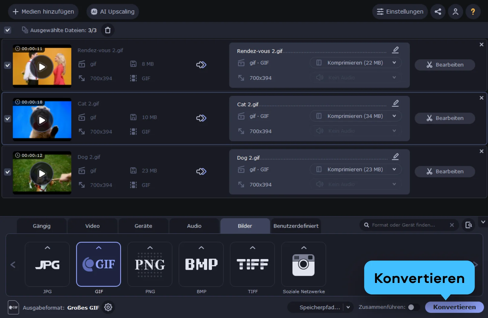 Klicken Sie auf Medien hinzufügen und wählen Sie Ihre GIF-Datei aus. Das Tool lädt die Datei direkt in den Bereich Komprimieren. Sie sehen sofort, wo es weitergeht, ohne lange nach Menüs oder versteckten Optionen suchen zu müssen. So können Sie GIF online komprimieren, auch wenn Sie das zum ersten Mal machen.