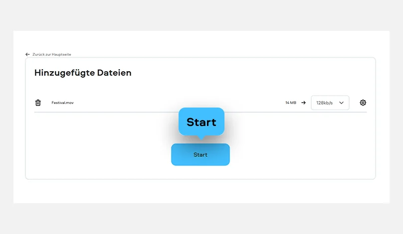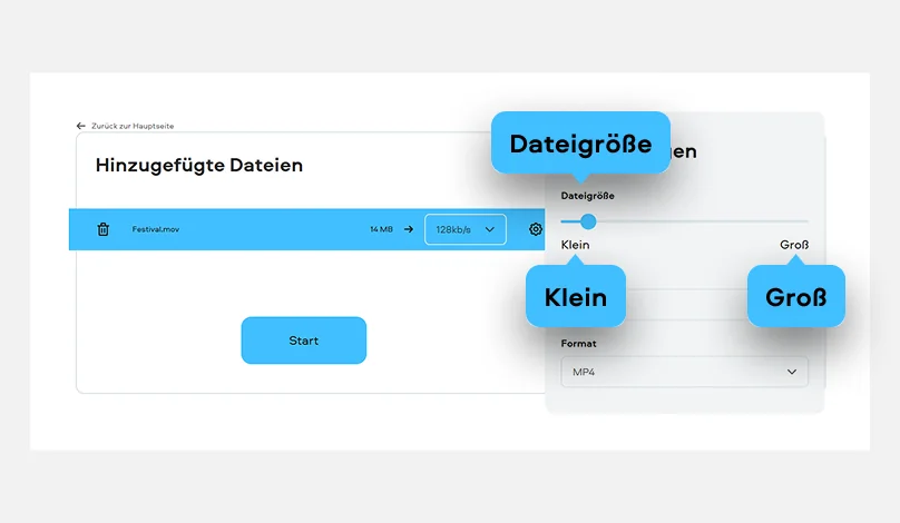 Dort wählen Sie aus, wie stark die Datei verkleinert werden soll, zum Beispiel über die angezeigte Bitrate. So können Sie die Dateigröße anpassen, ohne sich erst durch ein halbes Technik-Labyrinth zu kämpfen. Wenn Sie eine MOV-Datei komprimieren online möchten, ist genau dieser direkte Ablauf der große Vorteil.
