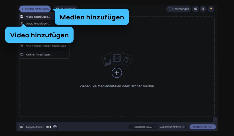 Öffnen Sie das Online-Tool und klicken Sie auf Medien hinzufügen. Wählen Sie danach Ihre MP4-Datei aus, damit sie in den Arbeitsbereich geladen wird. Nach dem Upload stehen die wichtigsten Optionen direkt bereit, sodass Sie ohne Verzögerung mit der Bearbeitung loslegen können.