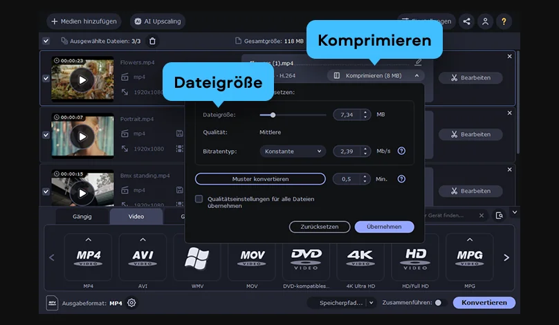 Klicken Sie bei der geladenen Datei auf Komprimieren. Nun öffnet sich ein Fenster, in dem Sie die gewünschte Ausgabegröße, die Qualität und den Bitratentyp festlegen können. So können Sie MP4 verkleinern, ohne den Überblick über die entscheidenden Einstellungen zu verlieren. Wenn nötig, bestimmen Sie hier ganz genau, wie stark die Datei reduziert werden soll.