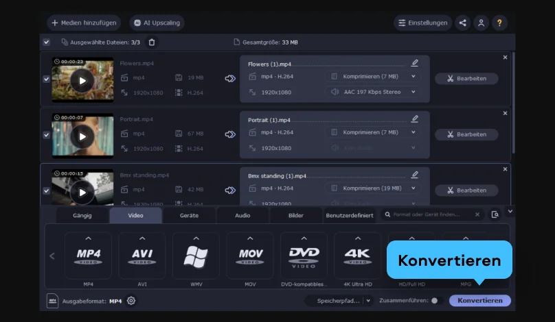 Für schnelle Aufgaben direkt im Browser eignet sich das Online-Tool von Movavi. Wenn Sie mehr Kontrolle über Größe, Qualität und weitere Einstellungen brauchen, ist Movavi Video Converter am Desktop die bessere Wahl. Damit können Sie eine MP4-Datei verkleinern und das Ergebnis gezielter an Ihren Bedarf anpassen.