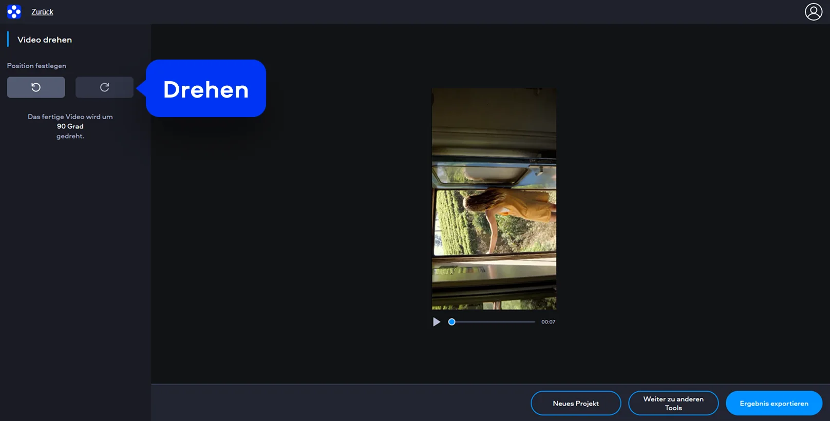 Im linken Bereich finden Sie die Optionen zum Drehen des Videos. Klicken Sie auf das passende Symbol, um den Clip nach links oder rechts zu drehen. Die Vorschau zeigt direkt, wie das Ergebnis aussieht. So lässt sich schnell prüfen, ob das Bild wieder richtig steht.