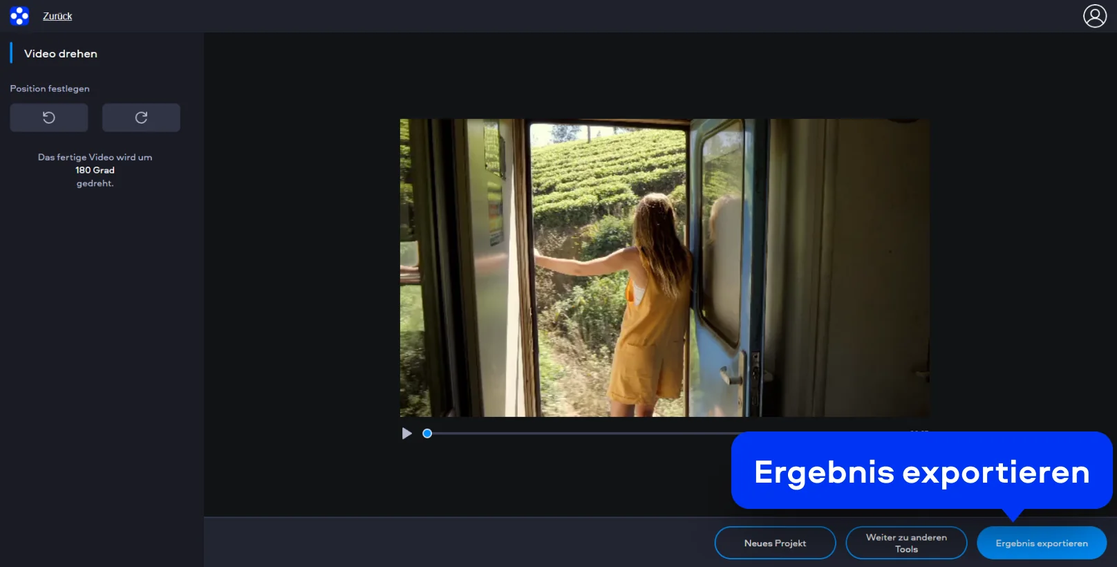 Wenn das Video auf dem Kopf steht oder spiegelverkehrt wirkt, können Sie es vor dem Export ganz einfach Video umdrehen. Das Tool verarbeitet die Änderung und erstellt die fertige Datei. Danach können Sie das gedrehte Video speichern und direkt weiterverwenden.