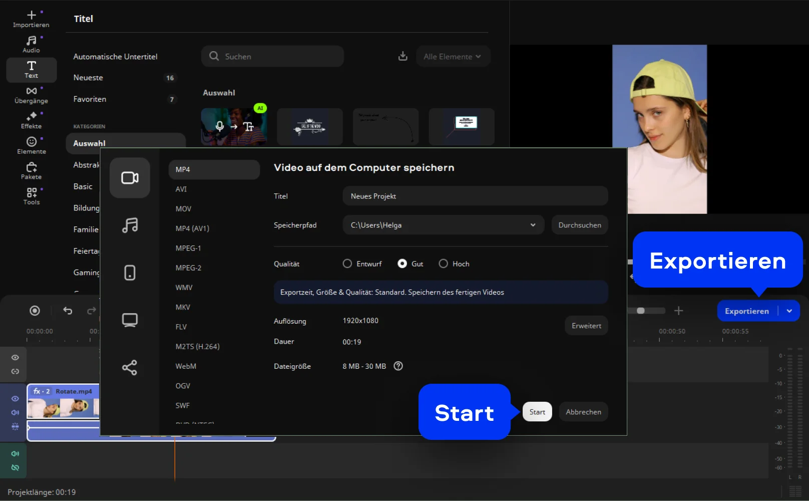 Öffnen Sie den Exportbereich und wählen Sie Format, Auflösung und Qualität. Dank Hardwarebeschleunigung wird das gedrehte Video schnell verarbeitet und ohne Qualitätsverlust in HD oder 4K gespeichert.