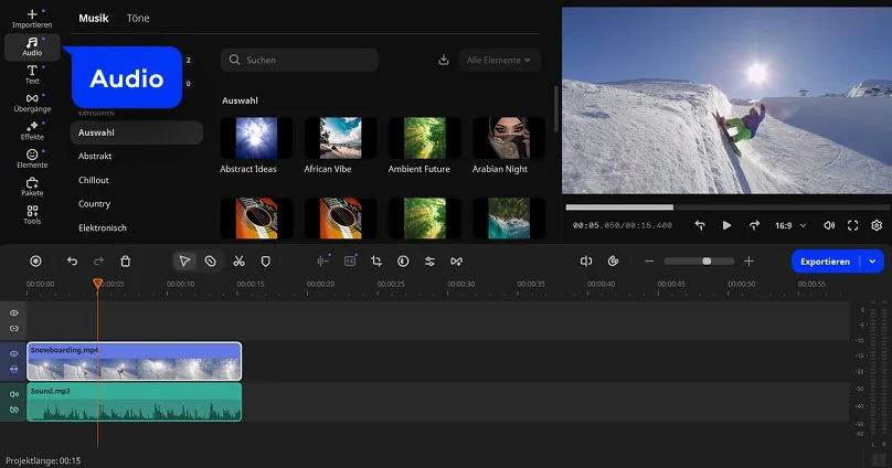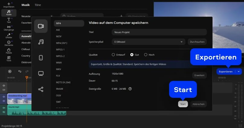 Mit dem Tool von Movavi können Sie ein Video mit Musik kostenlos online hinterlegen, ohne zusätzliche Software zu installieren. Die Anwendung läuft direkt im Browser und unterstützt gängige Formate wie MP4 und MP3. So können Sie schnell und unkompliziert Musik zum Video hinzufügen und Ihre Projekte auf jedem Gerät bearbeiten.