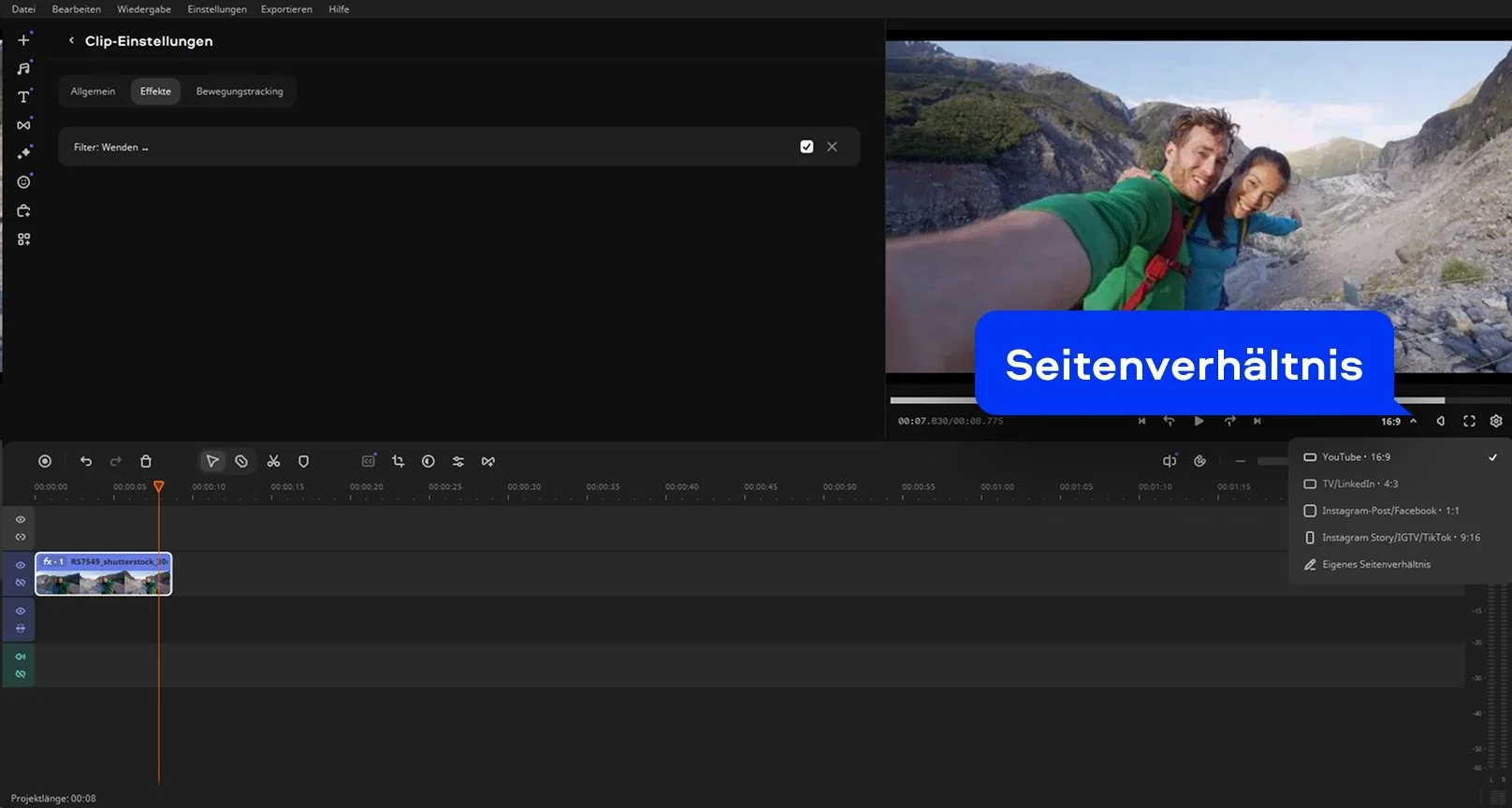 Ändern Sie das Seitenverhältnis (1:1, 4:5, 9:16) in nur wenigen Klicks und exportieren Sie Videos für YouTube, Facebook, Instagram und TikTok.