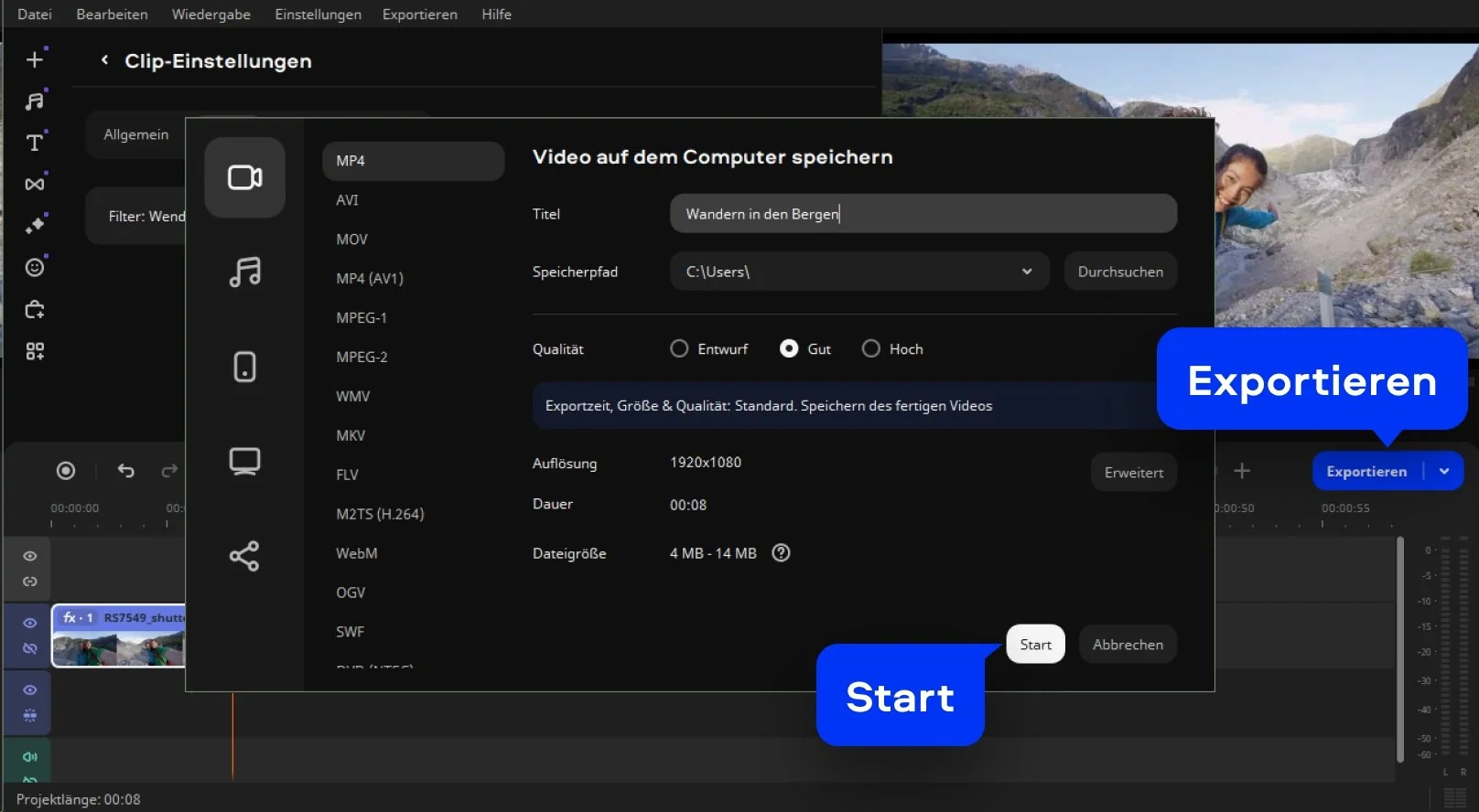 Sind Sie mit dem Ergebnis zufrieden, wählen Sie Exportieren. Legen Sie Format, Auflösung und Speicherort fest. Starten Sie den Export-Vorgang, um Ihr gespiegelt bearbeitetes Video zu sichern.