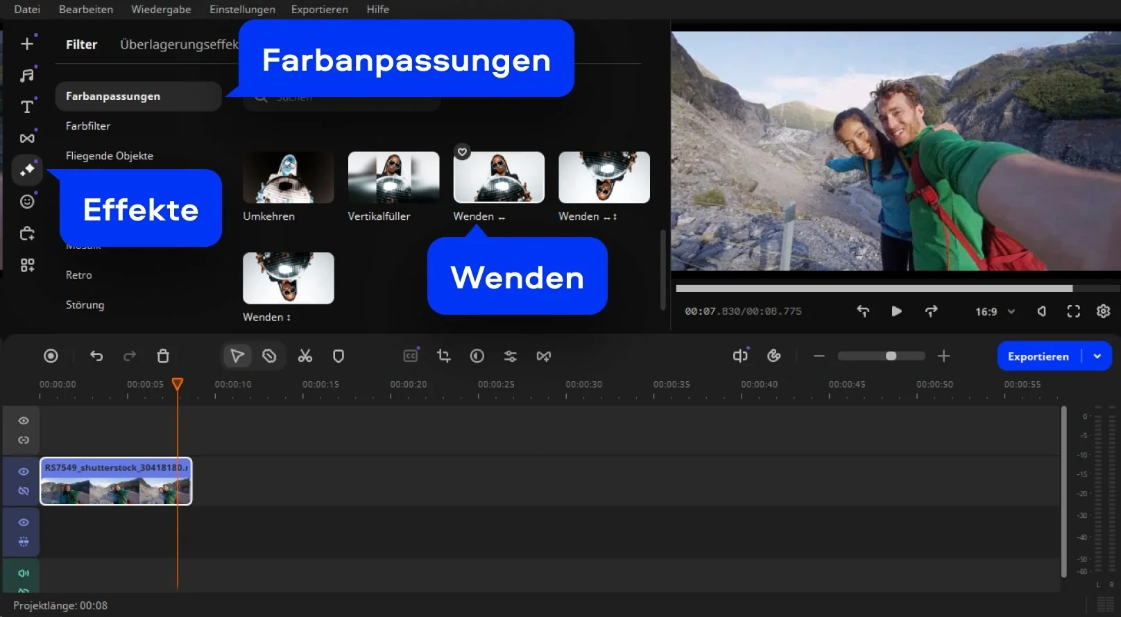 Klicken Sie den Videoclip in der Zeitleiste an, bis er markiert ist. Öffnen Sie dann Effekte > Filter > Farbanpassungen. In diesem Bereich wählen und aktivieren Sie Wenden oder Spiegeln, um die gewünschte Anpassung sofort auf Ihr Video anzuwenden.