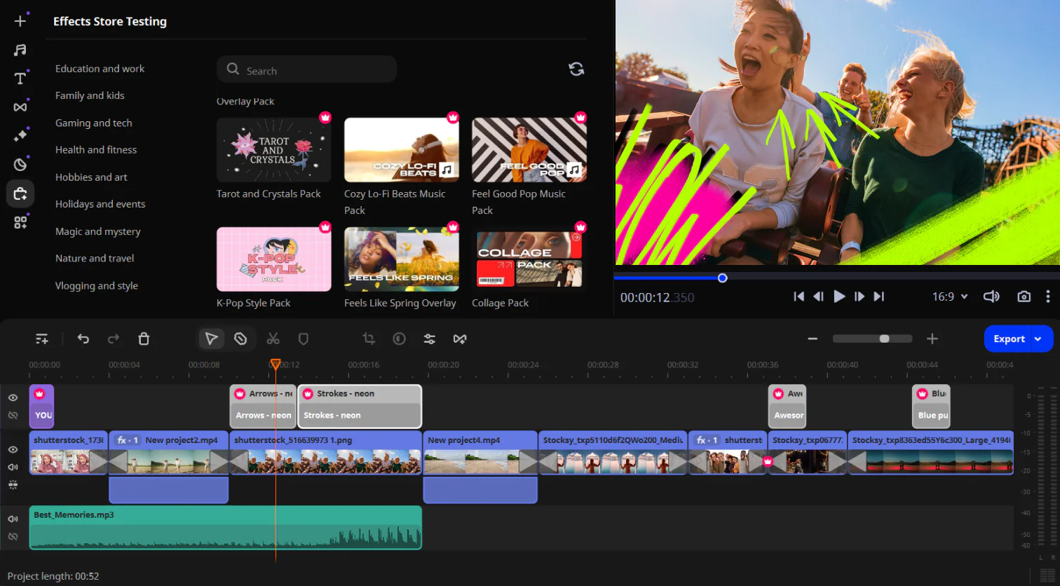 Movavi enthält über 10.000 kreative Effekte, integrierte Übergänge, Titel, Überlagerungen, Musikstücke, Sounds, Rahmen, Hintergründe, Sticker und mehr.