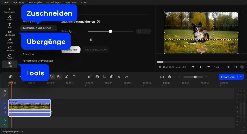 Schneiden Sie unerwünschte Szenen mit dem Trimm-Werkzeug und ziehen Sie die Clips in die gewünschte Reihenfolge.