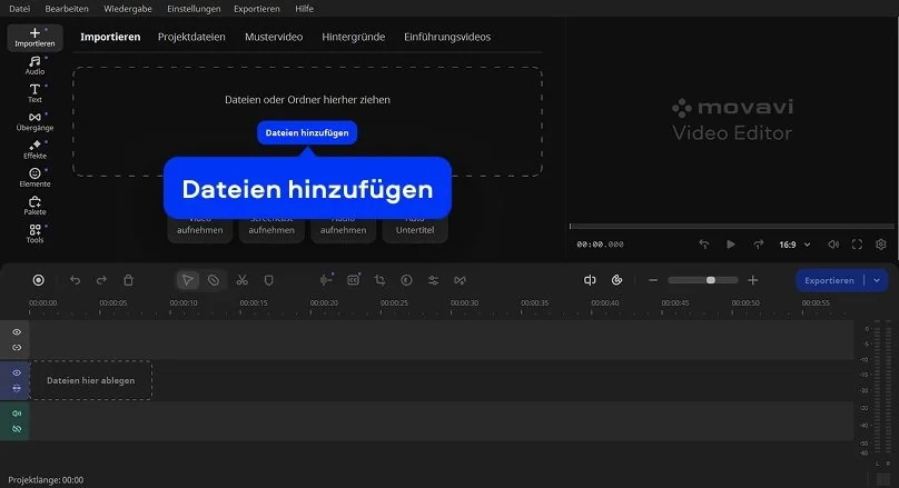 Öffnen Sie Movavi Video Editor und klicken Sie auf Dateien hinzufügen. Importieren Sie Ihre Videoclips, Bilder und Audiodateien per Drag-and-Drop in die Zeitleiste.